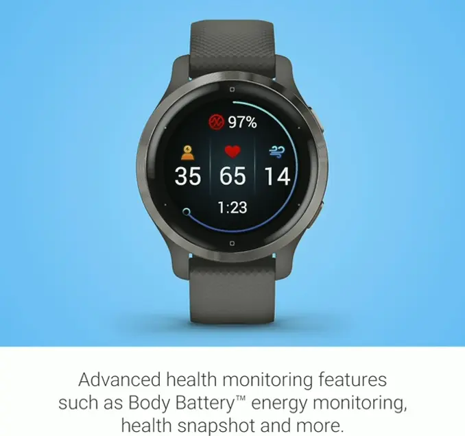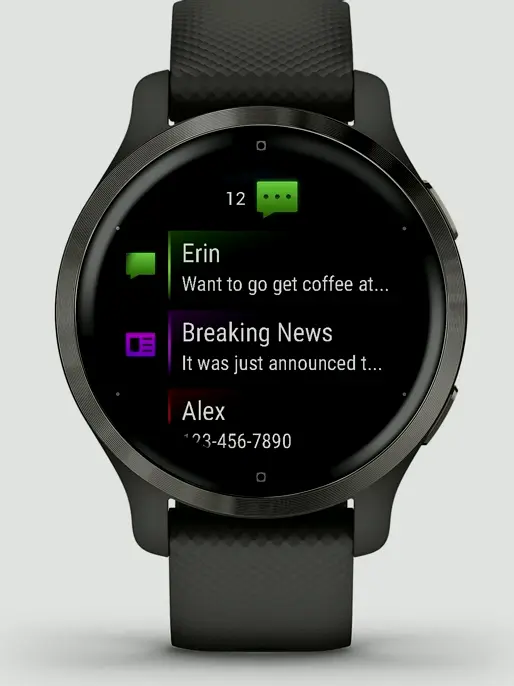 Suit your look with a fitness tracker available in two colors featuring a bright AMOLED screen. Enjoy an uninterrupted view of your well-being with power lasting 10 days in watch mode and up to 7 hours in GPS mode with music, plus power-saving mode. Know your body better with extensive health monitoring features including health snapshot, Body Battery energy levels, sleep score, fitness age, stress tracking and more (this device is intended to be an estimation of your activity and metrics; it is not a medical device). Use ready-made exercises that include cardio, yoga, strength, HIIT, and Pilates, customize your own in the Garmin Connect app on your compatible smartphone, or try Garmin Coach free adaptive training plans to help you prepare for your next running challenge. Download up to 650 songs to your watch, including playlists from Spotify, Amazon Music, or Deezer (may require a premium subscription), and connect with wireless headphones (not included) for phone-free listening. With a supported country and payment network, leave your money and credit cards at home; Garmin Pay contactless payments let you pay for purchases on the go. Never miss a call, text or social media notification with smart notifications delivered right to your wrist — when paired with a compatible Android or Apple smartphone. When paired with a compatible smartphone, safety and tracking features feature incident detection (during outdoor activities) and assistance, both of which send your live location to emergency contacts.